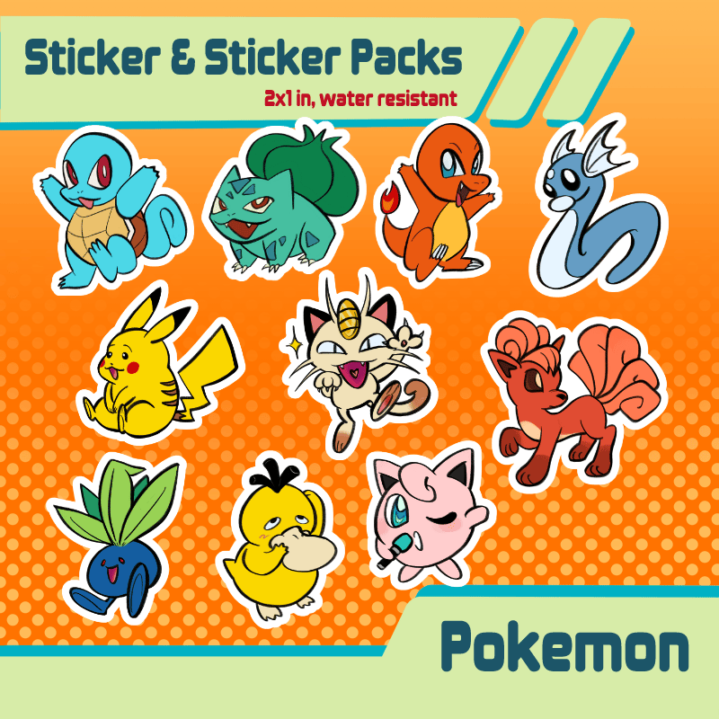 Die cut stickers of Pokémon starters and additional favorites from Gen 1.